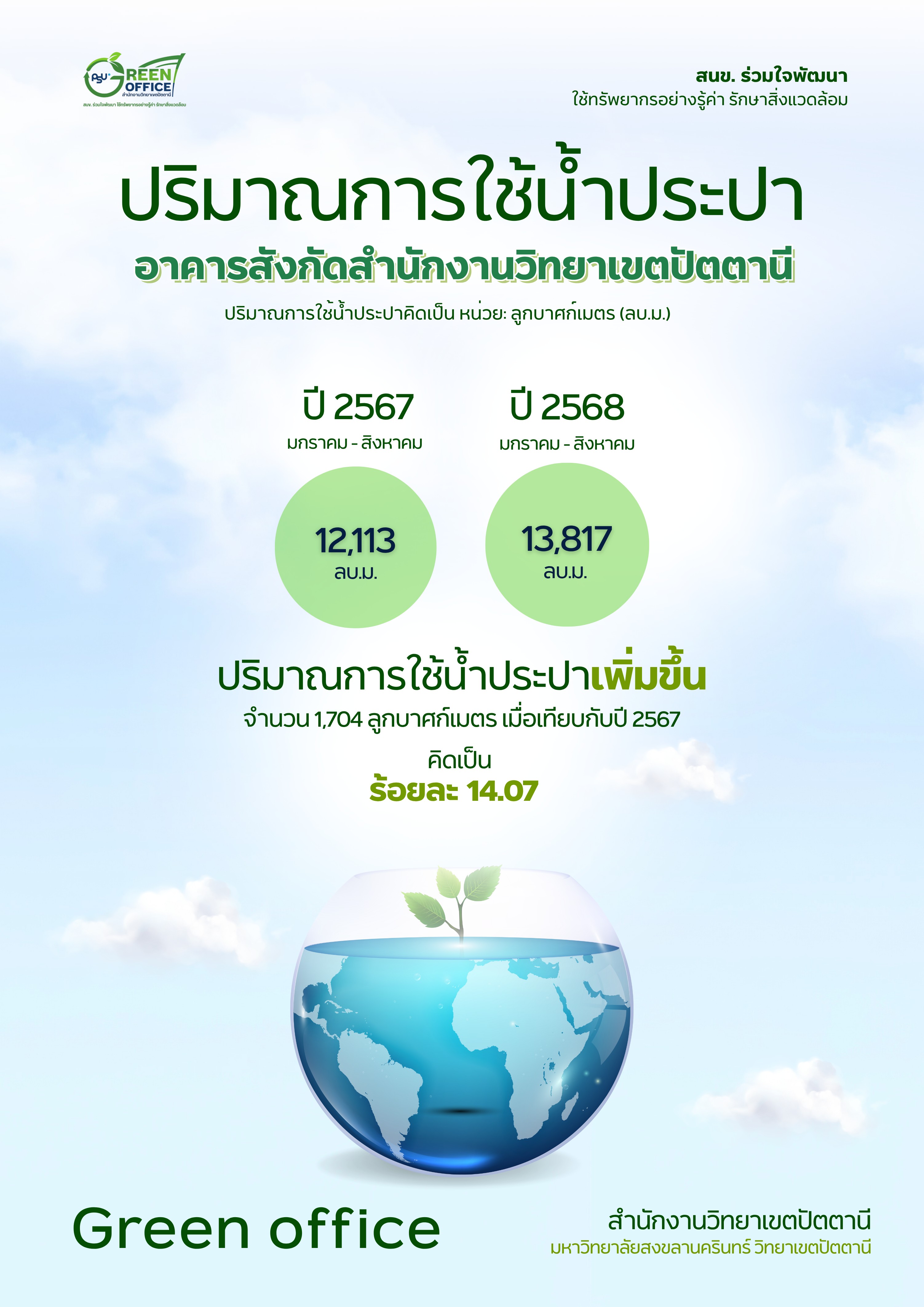 (1) การแสดงข้อมูลการใช้น้ำรายเดือน การเก็บข้อมูล กรณีบรรลุเป้าหมาย การเก็บข้อมูล กรณีไม่บรรลุเป้าหมาย หมายเหตุ การเปรียบเทียบข้อมูลสามารถเลือกได้ตามความเหมาะสมของหน่วย เช่น เปรียบเทียบต่อจำนวน | - 3.1.2 (1-1) ข้อมูลการใช้น้ำประปาอาคารสังกัดสำนักงานวิทยาเขตปัตตานี ปี พ.ศ. 2567 - 3.1.2 (1-2) ข้อมูลการใช้น้ำประปาอาคารสังกัดสำนักงานวิทยาเขตปัตตานี ปี พ.ศ. 2568 - 3.1.2 (2) ข้อมูลการวิเคราะห์ เปรียบเทียบการใช้น้ำประปาอาคารสังกัดสำนักงานวิทยาเขตปัตตานี - 3.1.2 (3) รายงานสรุปผลการใช้น้ำประปาของอาคารสังกัดสำนักงานวิทยาเขตปัตตานี - 3.1.2 (4) Infographic ปริมาณการใช้น้ำประปาอาคารสังกัดสำนักงานวิทยาเขตปัตตานี - 3.1.2 (5) กราฟแสดงการเปรียบเทียบข้อมูลการใช้น้ำประปาของอาคารสังกัดสำนักงานวิทยาเขตปัตตานี |